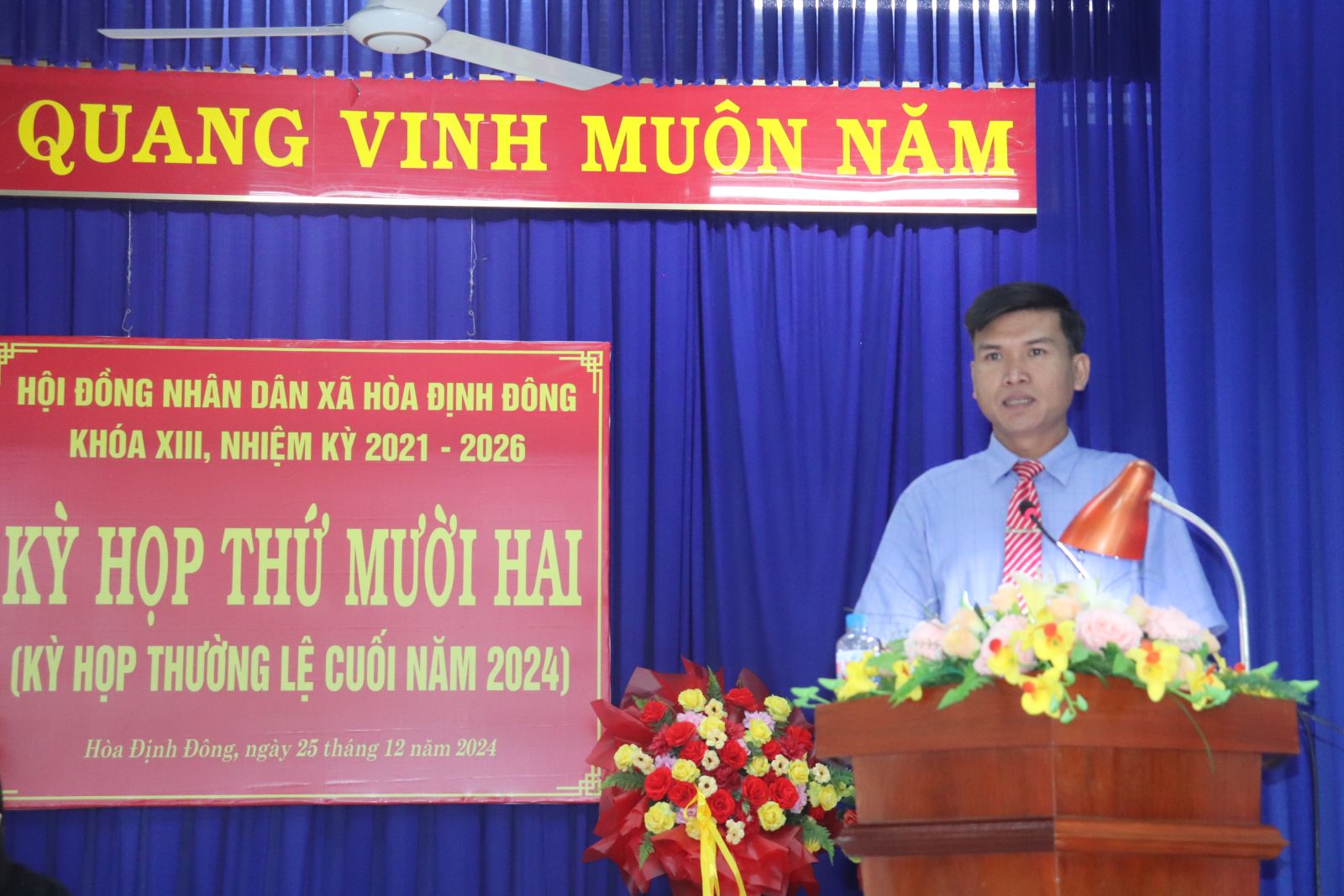 Ngày 25/12, HĐND xã Hòa Định Đông tổ chức kỳ họp thứ 12, kỳ họp thường lệ cuối năm 2024. Dự có đồng chí Lê Văn Hòa, Ủy viên Ban Thường vụ Huyện ủy, Phó Chủ tịch HĐND huyện; Ủy viên Ban chấp hành Đảng bộ huyện phụ trách địa bàn; đại biểu HĐND huyện được bầu trên địa bàn xã; lãnh đạo Đảng ủy, HĐND, UBND, Ủy ban MTTQ Việt Nam xã cùng các đại biểu HĐND xã.