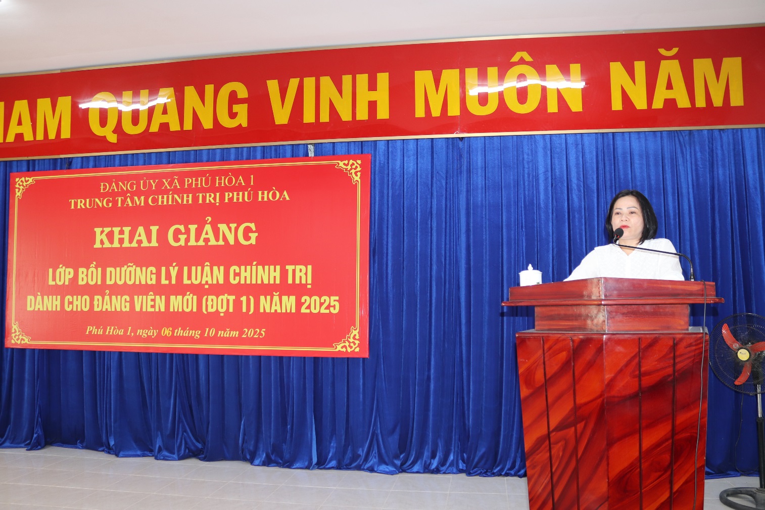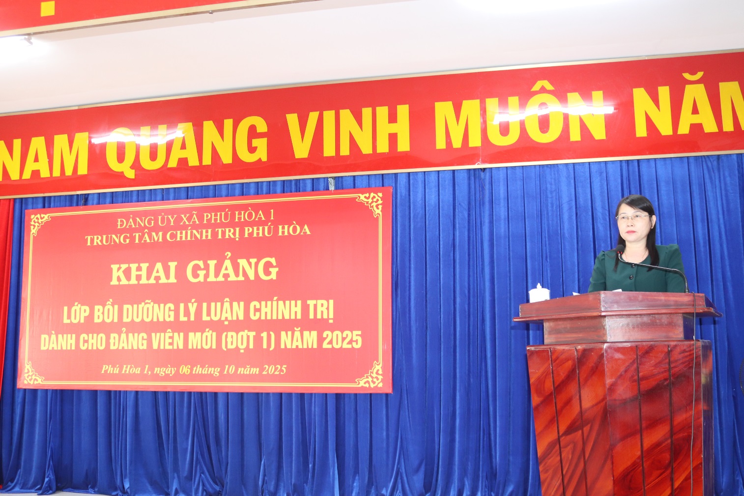 Đồng chí Phạm Thị Kiều Diễm, Ủy viên Ban Thường vụ Đảng ủy, Trưởng Ban Xây dựng Đảng xã Phú Hòa 1, Giám đốc Trung tâm Chính trị Phú Hòa phát biểu khai giảng lớp bồi dưỡng.