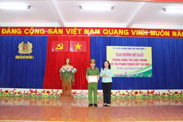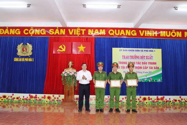 Nhằm kịp thời động viên tinh thần cán bộ, chiến sĩ, lãnh đạo Đảng ủy, UBND xã Phú Hòa 1 đã trao giấy khen cho 1 tập thể và 4 cá nhân có thành tích xuất sắc trong công tác đấu tranh với đối tượng trộm cắp tài sản.