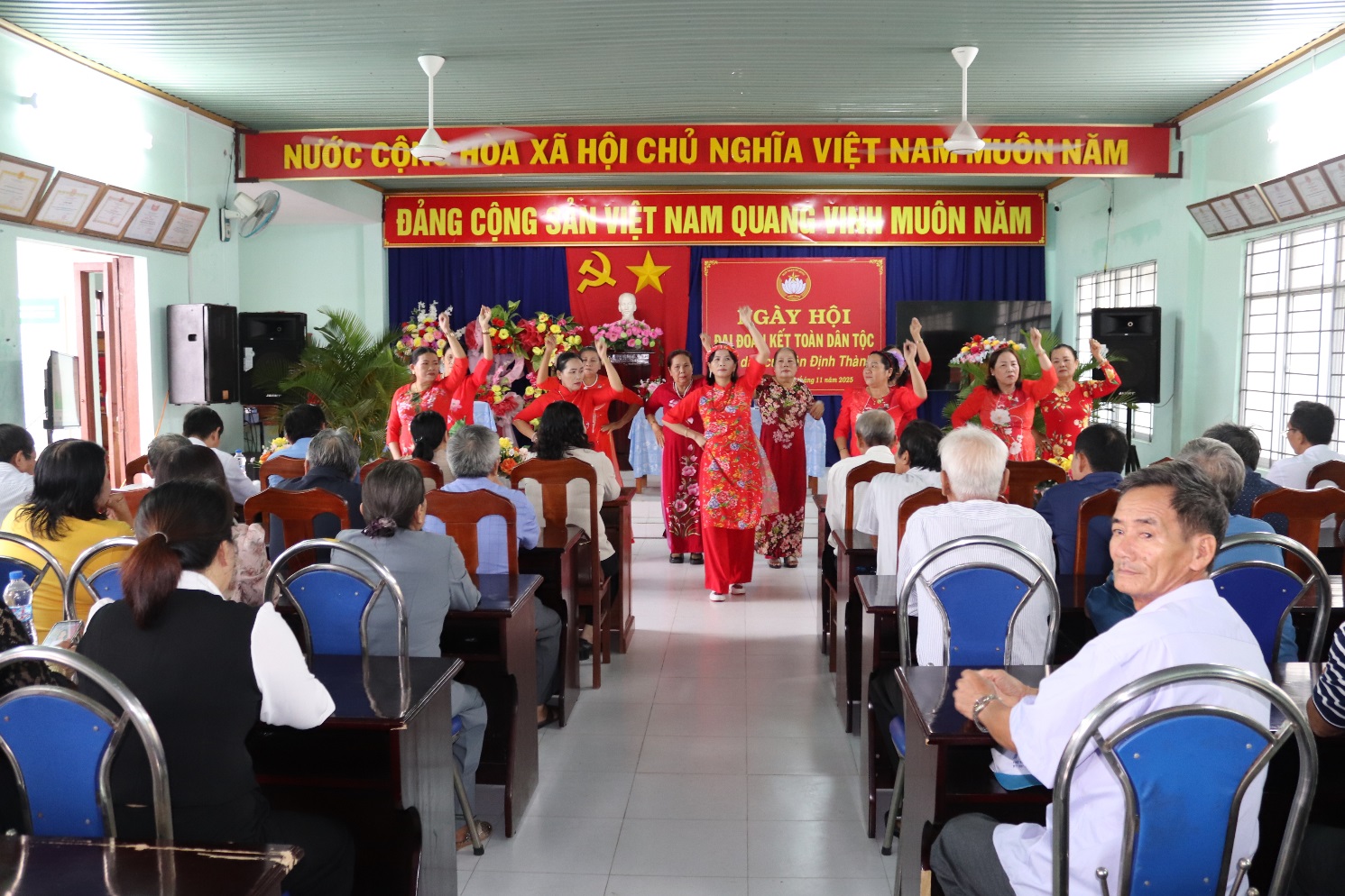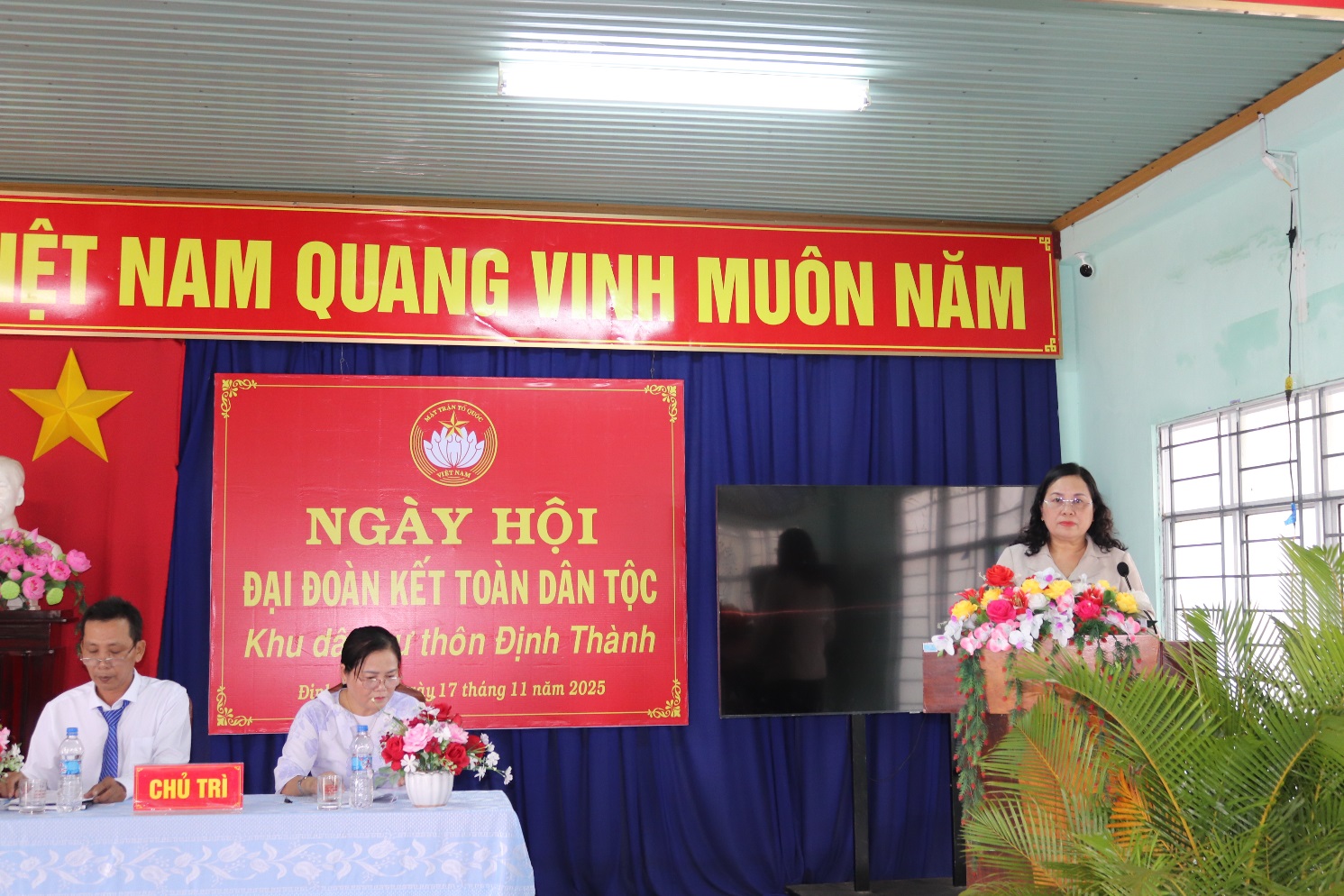 Phát biểu tại Ngày hội, đồng chí Huỳnh Thị Son, Bí thư Đảng ủy, Chủ tịch HĐND xã biểu dương tinh thần đoàn kết, trách nhiệm, đồng lòng của nhân dân thôn Định Thành trong thời gian qua; đồng thời mong muốn bà con tiếp tục phát huy truyền thống tốt đẹp, tích cực tham gia các phong trào thi đua yêu nước, xây dựng đời sống văn hóa, góp phần cùng Đảng bộ và chính quyền xã thực hiện thắng lợi các mục tiêu phát triển kinh tế - xã hội năm 2025.
