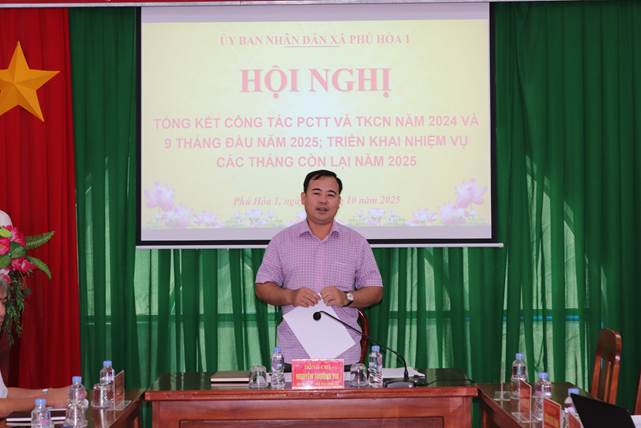 Sáng 23/10, UBND xã Phú Hòa 1 tổ chức hội nghị tổng kết công tác phòng, chống thiên tai và tìm kiếm cứu nạn năm 2024 và 9 tháng đầu năm 2025; triển khai nhiệm vụ phòng chống thiên tai những tháng cuối năm 2025. Đồng chí Nguyễn Trường Thi, Phó Bí thư Đảng ủy, Chủ tịch UBND xã, Trưởng Ban chỉ huy phòng thủ dân sự xã chủ trì hội nghị.