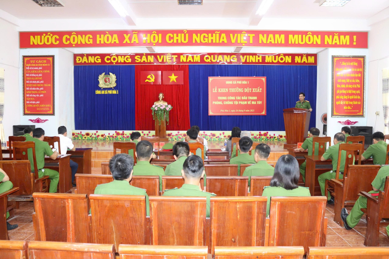 Sáng 26/9, UBND xã Phú Hòa 1 tổ chức khen thưởng đột xuất cho tập thể và cá nhân thuộc Công an xã vì có thành tích xuất sắc trong công tác đấu tranh phòng, chống tội phạm về ma túy.