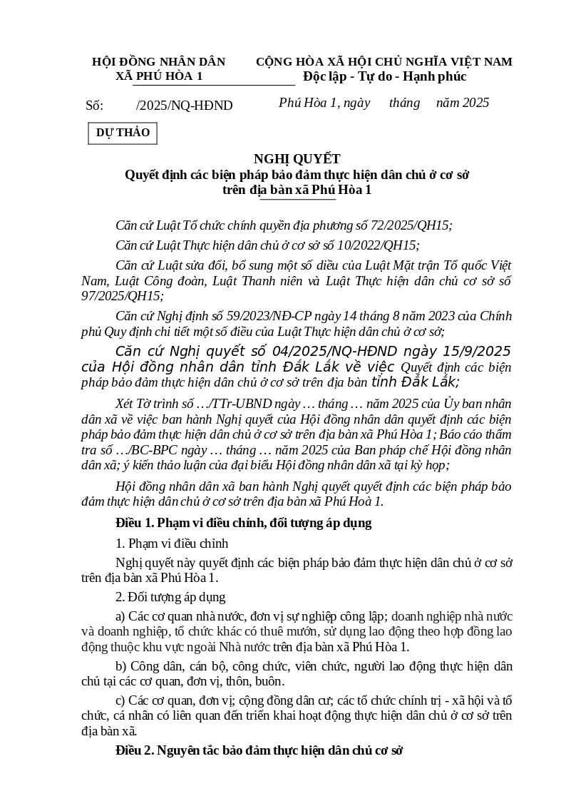 | 1 | Dự thảo NGHỊ QUYẾT Quyết định các biện pháp bảo đảm thực hiện dân chủ ở cơ sở trên địa bàn xã Phú Hòa 1 | ||||||