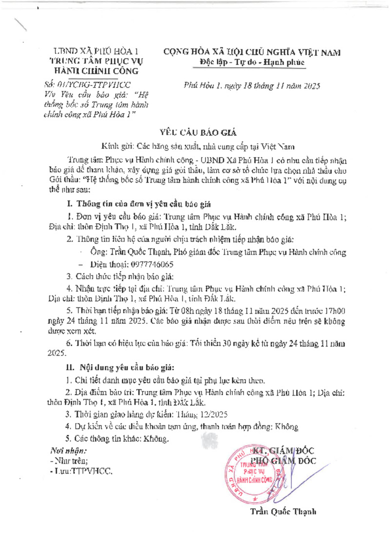 | Tiêu đề văn bản | Thông báo yêu cầu Báo giá: "hệ thống bốc số trung tâm phục vụ hành chính công xã Phú Hòa 1" | ||