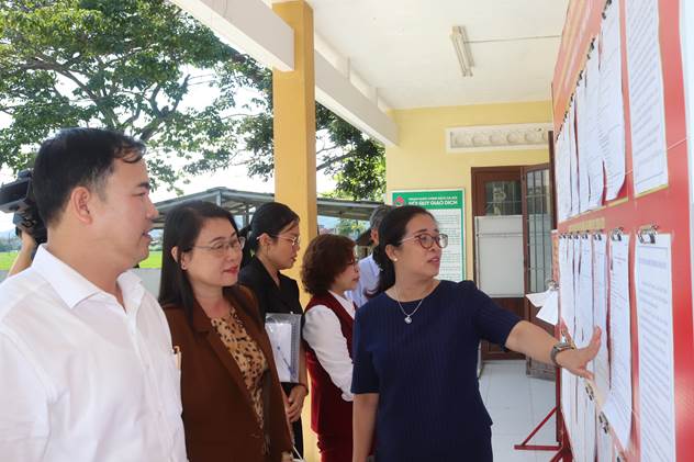 Đồng chí Phó Bí thư Tỉnh ủy Huỳnh Thị Chiến Hòa kiểm tra công tác chuẩn bị bầu cử tại một số điểm bầu cử của xã Phú Hòa 1.
