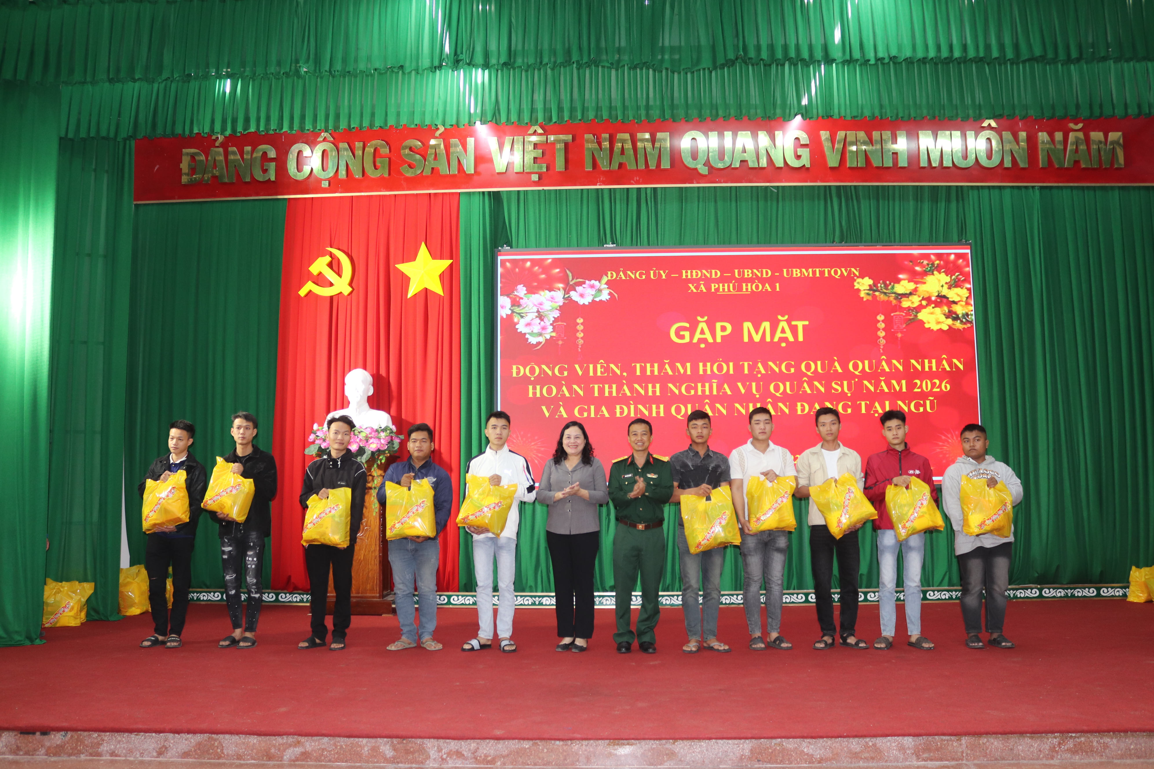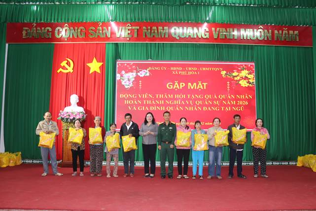 Sáng 9/2, Đảng ủy, HĐND, UBND, Ủy ban MTTQ Việt Nam xã Phú Hòa 1 tổ chức gặp mặt, động viên, thăm hỏi, tặng quà cho quân nhân hoàn thành nghĩa vụ quân sự trở về địa phương năm 2026 và gia đình quân nhân đang tại ngũ.
