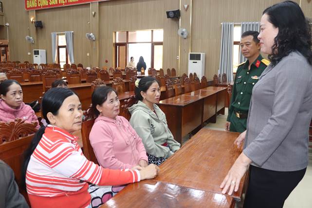 Đồng chí Huỳnh Thị Son, Bí thư Đảng ủy, Chủ tịch HĐND xã trò chuyện, thăm hỏi gia đình quân nhân đang tại ngũ.