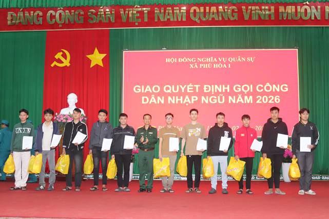 Hội đồng Nghĩa vụ quân sự xã Phú Hòa 1 tổ chức giao quyết định gọi công dân nhập ngũ năm 2026 và tặng quà cho thanh niên chuẩn bị nhập ngũ.