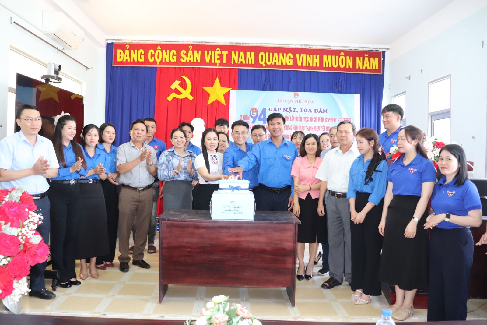 Các đại biểu thắp nến, cắt bánh kem mừng sinh nhật 94 năm của tổ chức Đoàn TNCS Hồ Chí Minh.