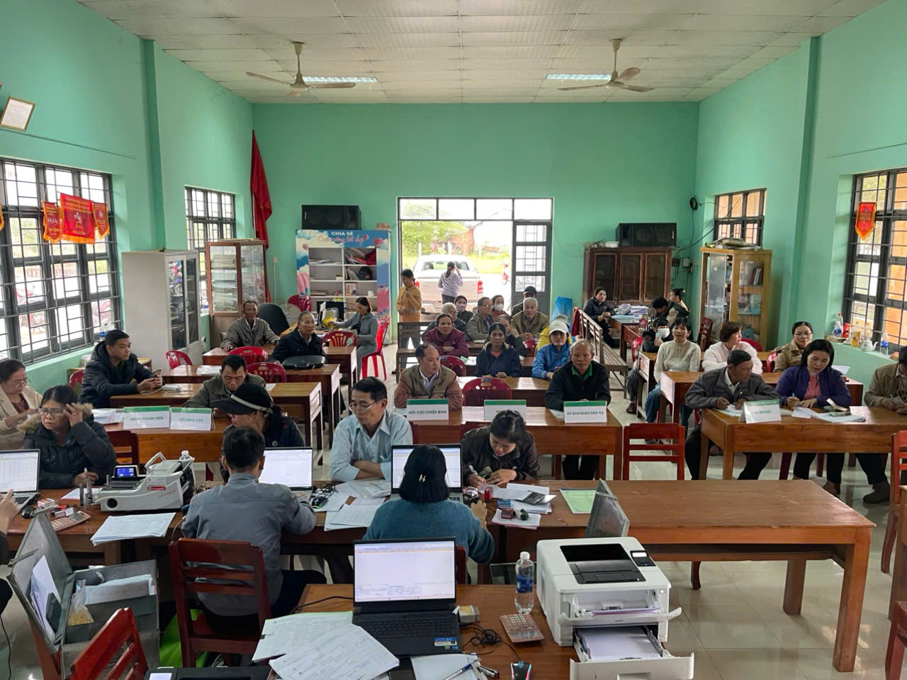 Cán bộ Phòng giao dịch Ngân hàng Chính sách xã hội Phú Hòa giải ngân vốn vay cho người dân tại điểm giao dịch.
