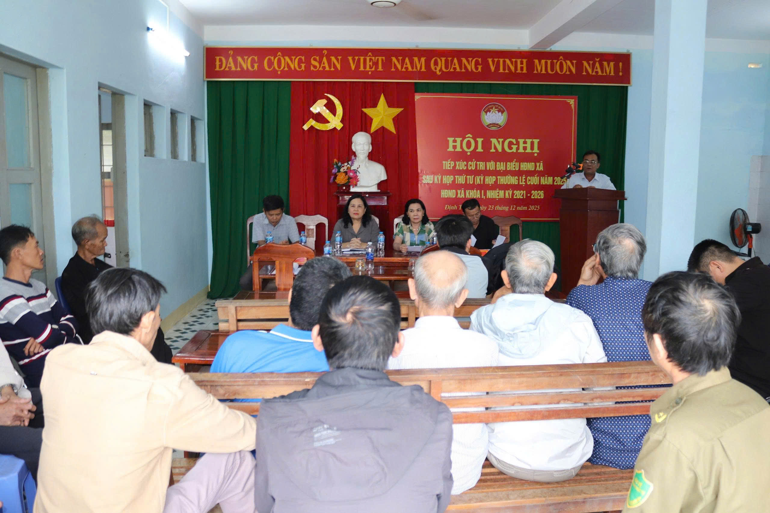 Kiến nghị đến HĐND xã, cử tri thôn Định Thọ 2 phản ánh các vấn đề về vệ sinh môi trường tại 1 số địa điểm trong xã; một số tuyến đường giao thông bị ngập nước khi trời mưa gây ảnh hưởng đến việc đi lại. Cử tri cũng phản ánh 1 số nội dung liên quan đến việc xả lũ của các thủy điện trên sông Ba; việc phân phối, cấp phát quà cho người dân bị ảnh hưởng bởi thiên tai,…