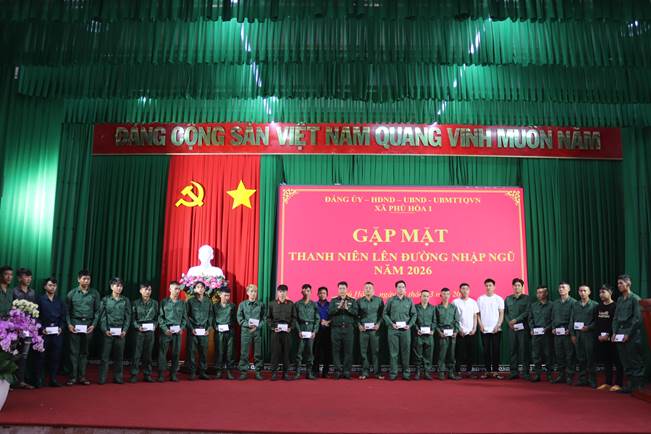 Ngày 2/3, Đảng ủy, HĐND, UBND, Ủy ban MTTQ Việt Nam xã Phú Hòa 1 tổ chức gặp mặt thanh niên chuẩn bị lên đường thực hiện nghĩa vụ quân sự và tham gia nghĩa vụ Công an nhân dân năm 2026.